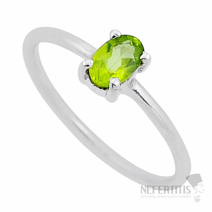 Strieborný prsteň s brúseným olivínom. Ag 925. Vďaka brúseným plôškam vynikne krásna farba olivínu, zvýraznená trblietkou pri dopadajúcom svetle. Kupujete priamo vyobrazený šperk. Veľkosť kameňa cca 0,5 cm.