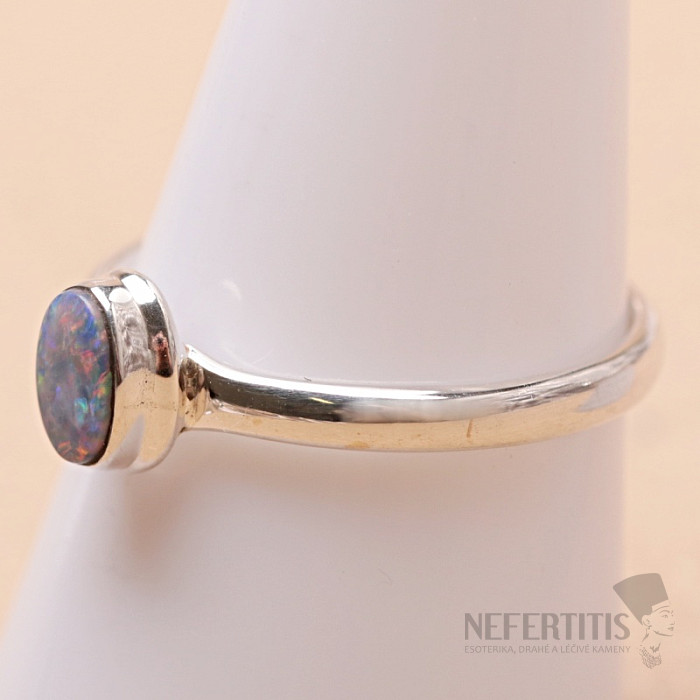 Elegantný strieborný prsteň s austrálskym opálom s krásnou hrou výrazných a sýtych farieb. Ag 925. Pôsobivý šperk, od pohľadu navodzujúci radosť a pocity harmónie. Vo chvíli, keď sa pri každom pohybe vašej ruky zapáli svetlo na povrchu opálu uchvacujúce iskry zakaždým inej farby, určite prepadnete kúzlu tohto nádherného kameňa. Veľkosť opálového dubletu je cca 0,7 cm. Kupujete priamo vyobrazený šperk.