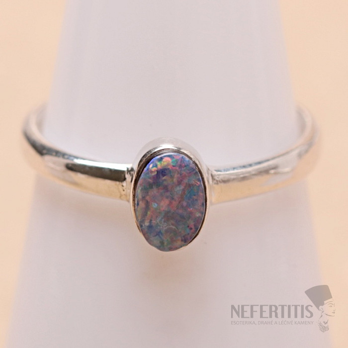 Elegantný strieborný prsteň s austrálskym opálom s krásnou hrou výrazných a sýtych farieb. Ag 925. Pôsobivý šperk, od pohľadu navodzujúci radosť a pocity harmónie. Vo chvíli, keď sa pri každom pohybe vašej ruky zapáli svetlo na povrchu opálu uchvacujúce iskry zakaždým inej farby, určite prepadnete kúzlu tohto nádherného kameňa. Veľkosť opálového dubletu je cca 0,6 cm. Kupujete priamo vyobrazený šperk.