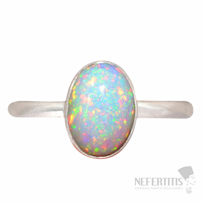 Elegantný strieborný prsteň s kabošonom etiópskeho opálu. Ag 925. Pôsobivý a elegantný šperk, od pohľadu navodzujúci radosť a pocity harmónie. Etiópske opály oproti austrálskym opálom doslova hýria až neónovo žiarivými odleskami farieb. Hoci na prvý pohľad na to nevyzerajú, ohňostroj farieb, ktorý z opálu v tomto prívesku vytryskne pri každom dopade svetla, očarí nielen vás, ale celé vaše okolie. Veľkosť kameňa cca 1 cm. Kupujete priamo vyobrazený šperk.