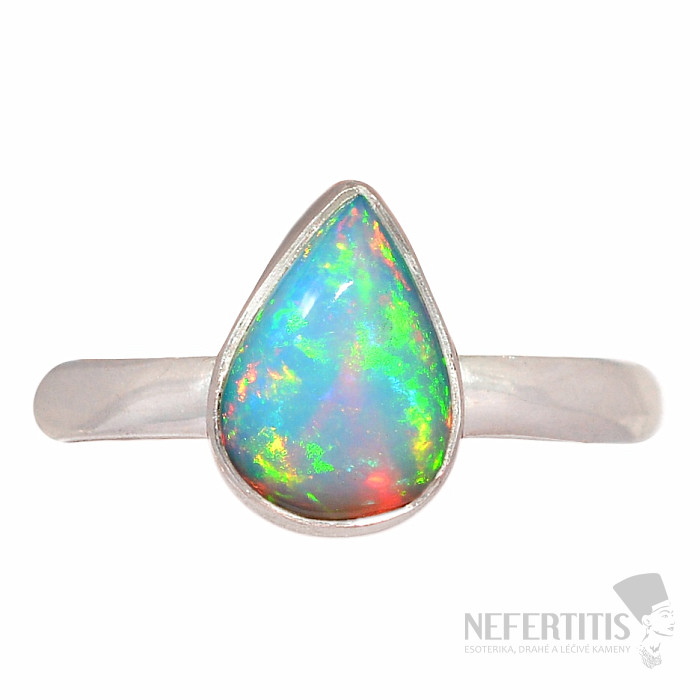 Elegantný strieborný prsteň s kabošonom etiópskeho opálu. Ag 925. Pôsobivý a elegantný šperk, od pohľadu navodzujúci radosť a pocity harmónie. Etiópske opály oproti austrálskym opálom doslova hýria až neónovo žiarivými odleskami farieb. Hoci na prvý pohľad na to nevyzerajú, ohňostroj farieb, ktorý z opálu v tomto prívesku vytryskne pri každom dopade svetla, očarí nielen vás, ale celé vaše okolie. Veľkosť kameňa cca 0,9 cm. Kupujete priamo vyobrazený šperk.