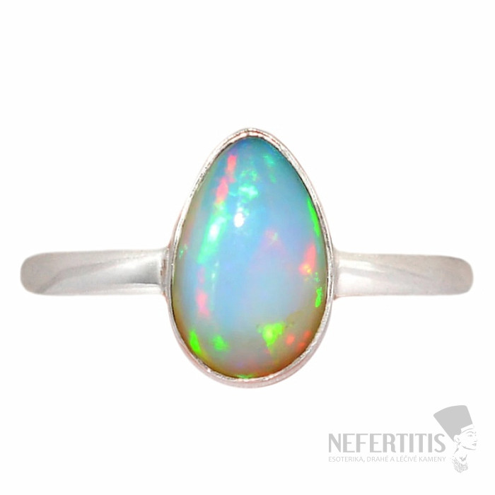 Elegantný strieborný prsteň s kabošonom etiópskeho opálu. Ag 925. Pôsobivý a elegantný šperk, od pohľadu navodzujúci radosť a pocity harmónie. Etiópske opály oproti austrálskym opálom doslova hýria až neónovo žiarivými odleskami farieb. Hoci na prvý pohľad na to nevyzerajú, ohňostroj farieb, ktorý z opálu v tomto prívesku vytryskne pri každom dopade svetla, očarí nielen vás, ale celé vaše okolie. Veľkosť kameňa cca 1 cm. Kupujete priamo vyobrazený šperk.