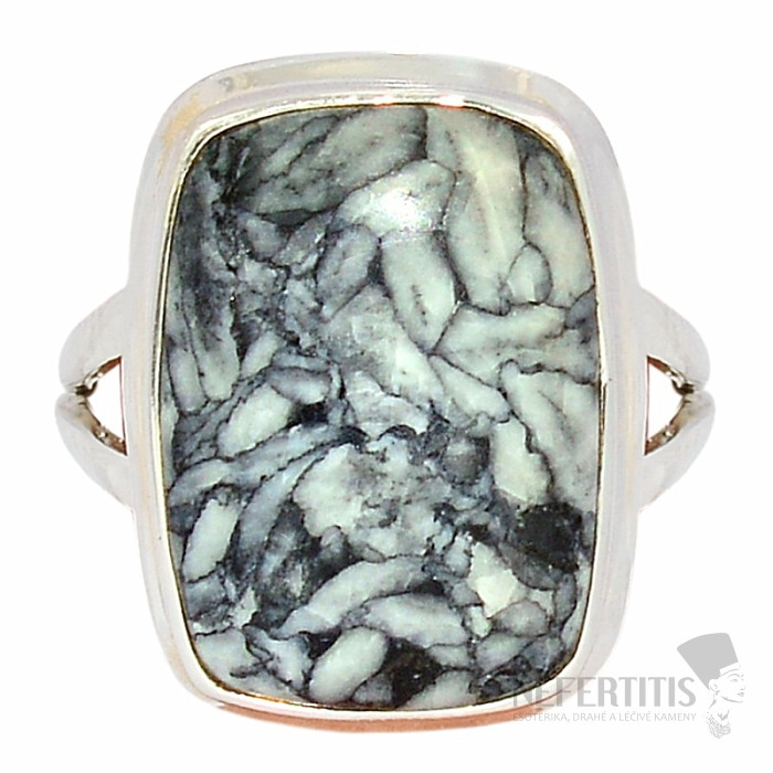 Strieborný prsteň s dekoratívnym vzácnym pinolitom zasadeným do strieborného rámčeka. Ag 925. Pinolit je grafitom pigmentovaný, svetlo šedý až takmer čierny dolomit s inklúziami bielych magnezitových zŕn, ktoré pripomínajú semená borovíc a odtiaľ je odvodený názov pinolitu, pretože borovica po latinsky je "pinus". Veľkosť kameňa je cca 1,9 cm. Kupujete priamo vyobrazený šperk.