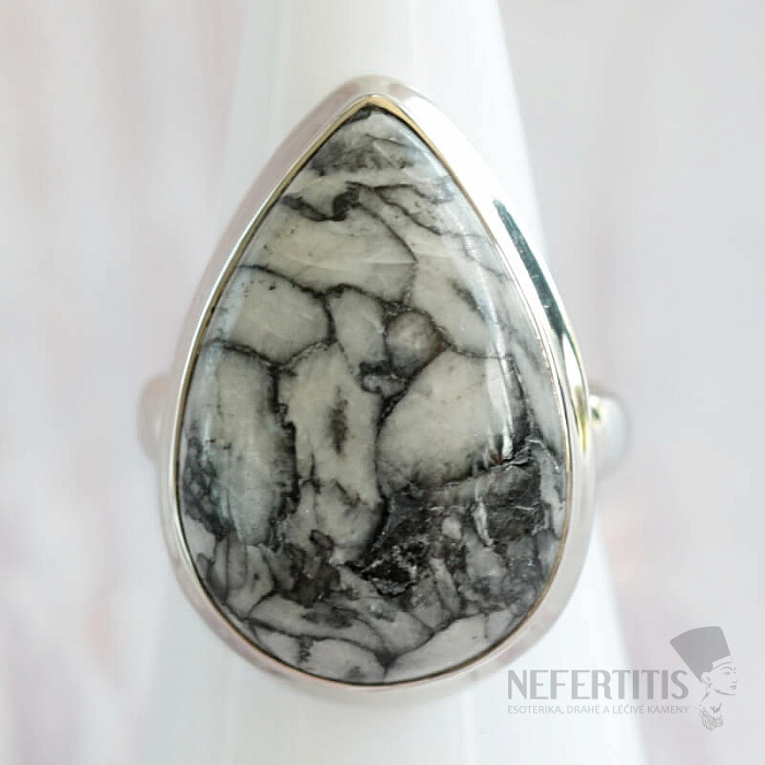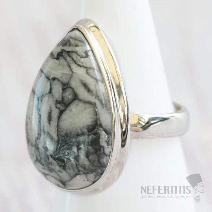 Strieborný prsteň s dekoratívnym vzácnym pinolitom zasadeným do strieborného rámčeka. Ag 925. Pinolit je grafitom pigmentovaný, svetlo šedý až takmer čierny dolomit s inklúziami bielych magnezitových zŕn, ktoré pripomínajú semená borovíc a odtiaľ je odvodený názov pinolitu, pretože borovica po latinsky je "pinus". Veľkosť kameňa je cca 2,5 cm. Kupujete priamo vyobrazený šperk.