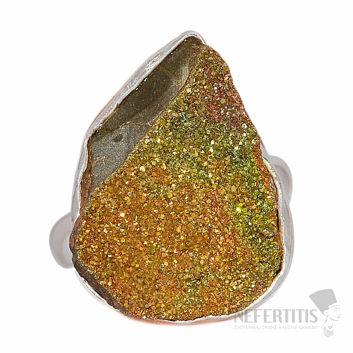 Nádherný strieborný prsteň s dúhovou pyritovou drôzičkou . Dúhový pyrit je pomerne vzácny a za svoju úchvatnú farbu vďačí zvýšenému obsahu železa. Ag 925. Kupujete priamo vyobrazený šperk. Novinka v našej ponuke. Veľkosť kameňa cca 2,2 cm .