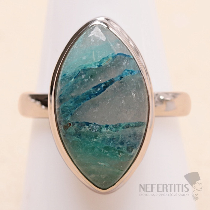 Pôvabný strieborný prsteň so vzácnym a zberateľsky ceneným prírodným Quantum quattro. Ag 925. Quantum quattro je kombináciou štyroch minerálov - shattuckitu, dioptasu, malachitu a chryzokolu. Každý šperk je originálny, neopakovateľný a vďaka farebnej kombinácii a usporiadaniu minerálov podnecuje fantáziu, pripomína pohľad na Zem z vtáčej perspektívy. Budete mať krásny šperk, ktorý nikto neprehliadne, vhodný na rôzne príležitosti. Kupujete priamo vyobrazený šperk. Veľkosť kameňa cca 2,2 cm.