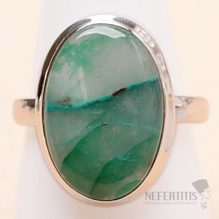Pôvabný strieborný prsteň so vzácnym a zberateľsky ceneným prírodným Quantum quattro. Ag 925. Quantum quattro je kombináciou štyroch minerálov - shattuckitu, dioptasu, malachitu a chryzokolu. Každý šperk je originálny, neopakovateľný a vďaka farebnej kombinácii a usporiadaniu minerálov podnecuje fantáziu, pripomína pohľad na Zem z vtáčej perspektívy. Budete mať krásny šperk, ktorý nikto neprehliadne, vhodný na rôzne príležitosti. Kupujete priamo vyobrazený šperk. Veľkosť kameňa cca 2,1 cm.
