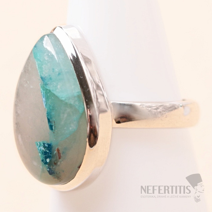 Pôvabný strieborný prsteň so vzácnym a zberateľsky ceneným prírodným Quantum quattro. Ag 925. Quantum quattro je kombináciou štyroch minerálov - shattuckitu, dioptasu, malachitu a chryzokolu. Každý šperk je originálny, neopakovateľný a vďaka farebnej kombinácii a usporiadaniu minerálov podnecuje fantáziu, pripomína pohľad na Zem z vtáčej perspektívy. Budete mať krásny šperk, ktorý nikto neprehliadne, vhodný na rôzne príležitosti. Kupujete priamo vyobrazený šperk. Veľkosť kameňa cca 1,9 cm.