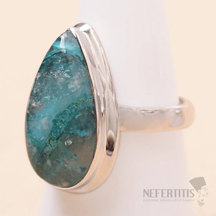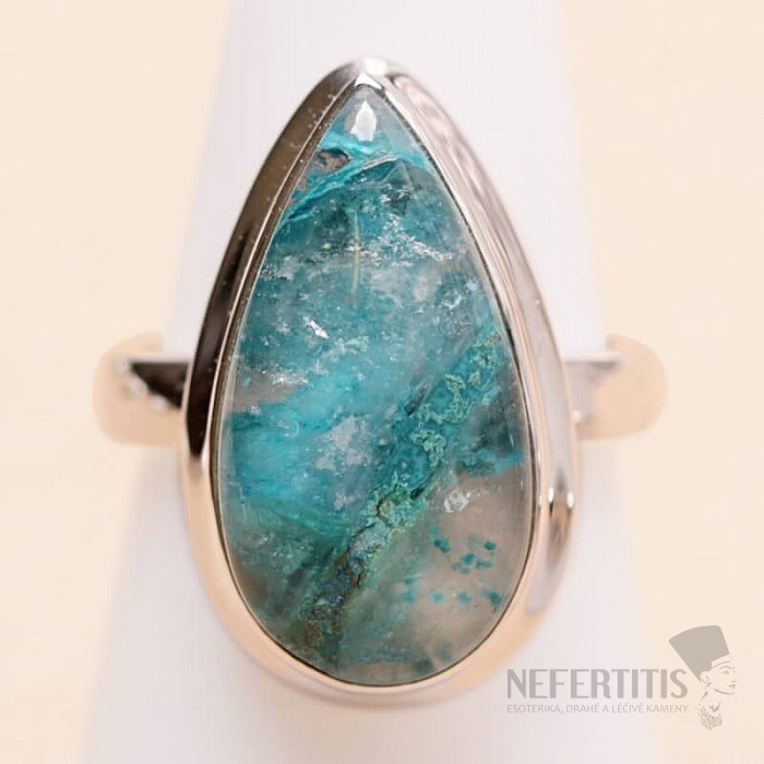 Pôvabný strieborný prsteň so vzácnym a zberateľsky ceneným prírodným Quantum quattro. Ag 925. Quantum quattro je kombináciou štyroch minerálov - shattuckitu, dioptasu, malachitu a chryzokolu. Každý šperk je originálny, neopakovateľný a vďaka farebnej kombinácii a usporiadaniu minerálov podnecuje fantáziu, pripomína pohľad na Zem z vtáčej perspektívy. Budete mať krásny šperk, ktorý nikto neprehliadne, vhodný na rôzne príležitosti. Kupujete priamo vyobrazený šperk. Veľkosť kameňa cca 2,2 cm.