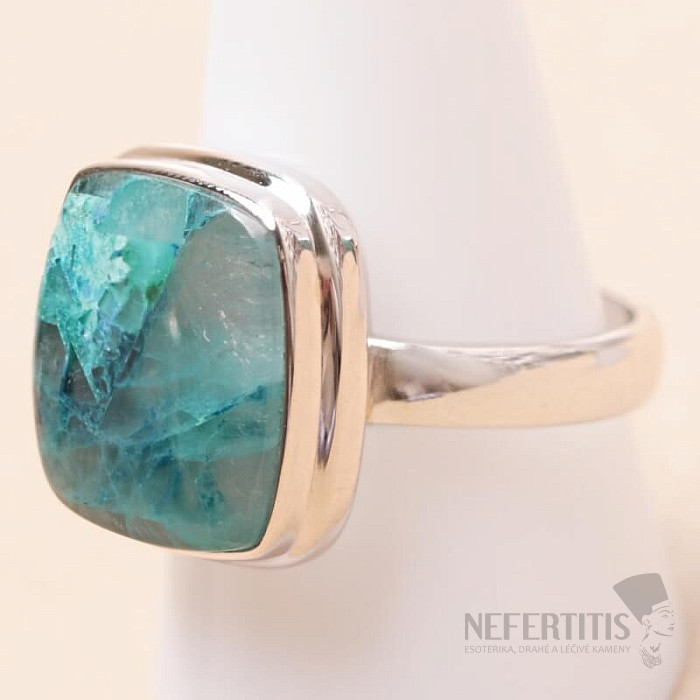 Pôvabný strieborný prsteň so vzácnym a zberateľsky ceneným prírodným Quantum quattro. Ag 925. Quantum quattro je kombináciou štyroch minerálov - shattuckitu, dioptasu, malachitu a chryzokolu. Každý šperk je originálny, neopakovateľný a vďaka farebnej kombinácii a usporiadaniu minerálov podnecuje fantáziu, pripomína pohľad na Zem z vtáčej perspektívy. Budete mať krásny šperk, ktorý nikto neprehliadne, vhodný na rôzne príležitosti. Kupujete priamo vyobrazený šperk. Veľkosť kameňa cca 1,7 cm.