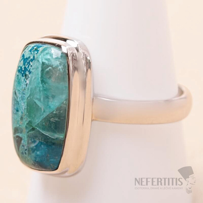 Pôvabný strieborný prsteň so vzácnym a zberateľsky ceneným prírodným Quantum quattro. Ag 925. Quantum quattro je kombináciou štyroch minerálov - shattuckitu, dioptasu, malachitu a chryzokolu. Každý šperk je originálny, neopakovateľný a vďaka farebnej kombinácii a usporiadaniu minerálov podnecuje fantáziu, pripomína pohľad na Zem z vtáčej perspektívy. Budete mať krásny šperk, ktorý nikto neprehliadne, vhodný na rôzne príležitosti. Kupujete priamo vyobrazený šperk. Veľkosť kameňa cca 1,9 cm.