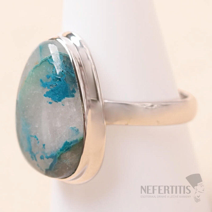 Pôvabný strieborný prsteň so vzácnym a zberateľsky ceneným prírodným Quantum quattro. Ag 925. Quantum quattro je kombináciou štyroch minerálov - shattuckitu, dioptasu, malachitu a chryzokolu. Každý šperk je originálny, neopakovateľný a vďaka farebnej kombinácii a usporiadaniu minerálov podnecuje fantáziu, pripomína pohľad na Zem z vtáčej perspektívy. Budete mať krásny šperk, ktorý nikto neprehliadne, vhodný na rôzne príležitosti. Kupujete priamo vyobrazený šperk. Veľkosť kameňa cca 2,1 cm.