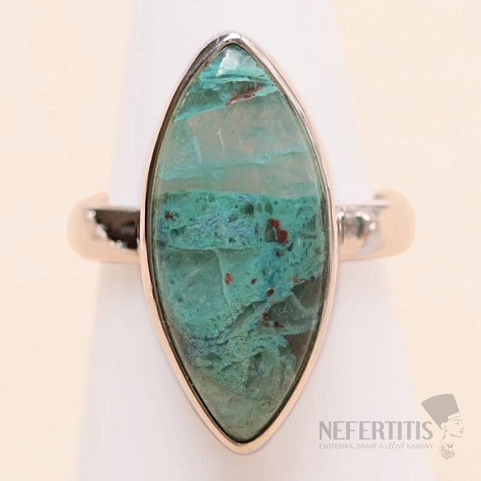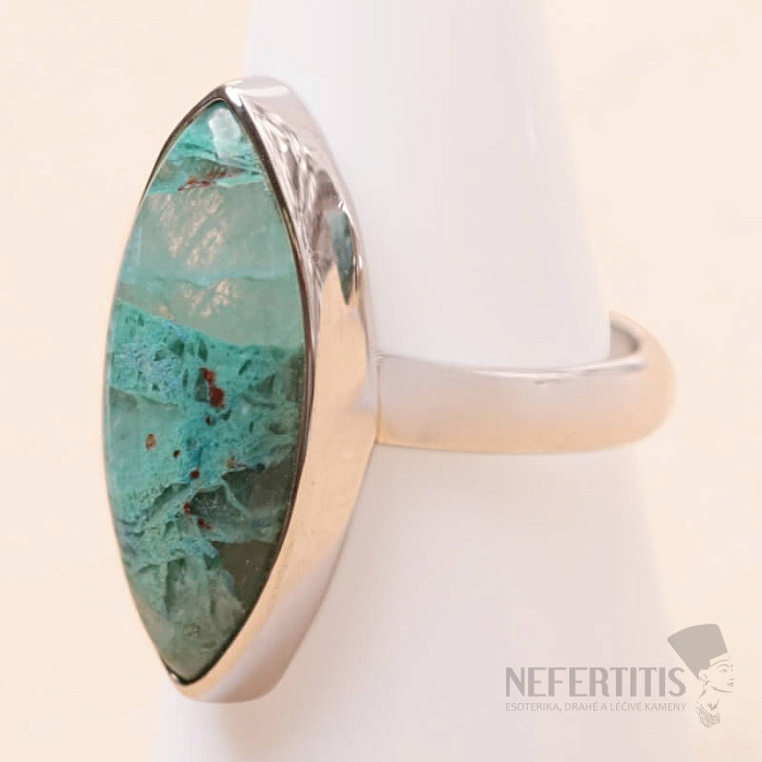 Pôvabný strieborný prsteň so vzácnym a zberateľsky ceneným prírodným Quantum quattro. Ag 925. Quantum quattro je kombináciou štyroch minerálov - shattuckitu, dioptasu, malachitu a chryzokolu. Každý šperk je originálny, neopakovateľný a vďaka farebnej kombinácii a usporiadaniu minerálov podnecuje fantáziu, pripomína pohľad na Zem z vtáčej perspektívy. Budete mať krásny šperk, ktorý nikto neprehliadne, vhodný na rôzne príležitosti. Kupujete priamo vyobrazený šperk. Veľkosť kameňa cca 2,3 cm.
