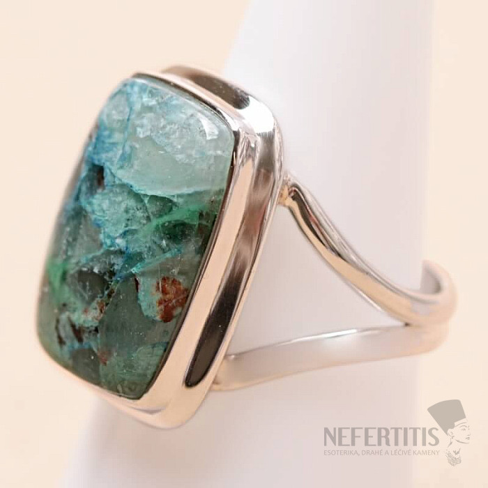 Pôvabný strieborný prsteň so vzácnym a zberateľsky ceneným prírodným Quantum quattro. Ag 925. Quantum quattro je kombináciou štyroch minerálov - shattuckitu, dioptasu, malachitu a chryzokolu. Každý šperk je originálny, neopakovateľný a vďaka farebnej kombinácii a usporiadaniu minerálov podnecuje fantáziu, pripomína pohľad na Zem z vtáčej perspektívy. Budete mať krásny šperk, ktorý nikto neprehliadne, vhodný na rôzne príležitosti. Kupujete priamo vyobrazený šperk. Veľkosť kameňa cca 2,1 cm.