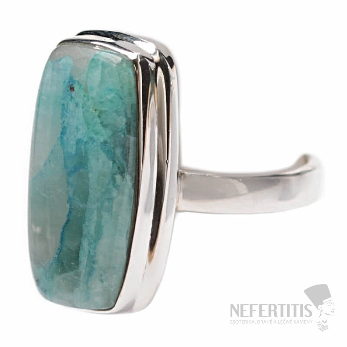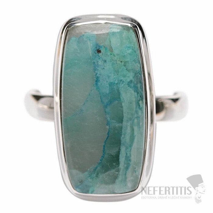 Pôvabný strieborný prsteň so vzácnym a zberateľsky ceneným prírodným Quantum quattro. Ag 925. Quantum quattro je kombináciou štyroch minerálov - shattuckitu, dioptasu, malachitu a chryzokolu. Každý šperk je originálny, neopakovateľný a vďaka farebnej kombinácii a usporiadaniu minerálov podnecuje fantáziu, pripomína pohľad na Zem z vtáčej perspektívy. Budete mať krásny šperk, ktorý nikto neprehliadne, vhodný na rôzne príležitosti. Kupujete priamo vyobrazený šperk. Veľkosť kameňa cca 2,3 cm.