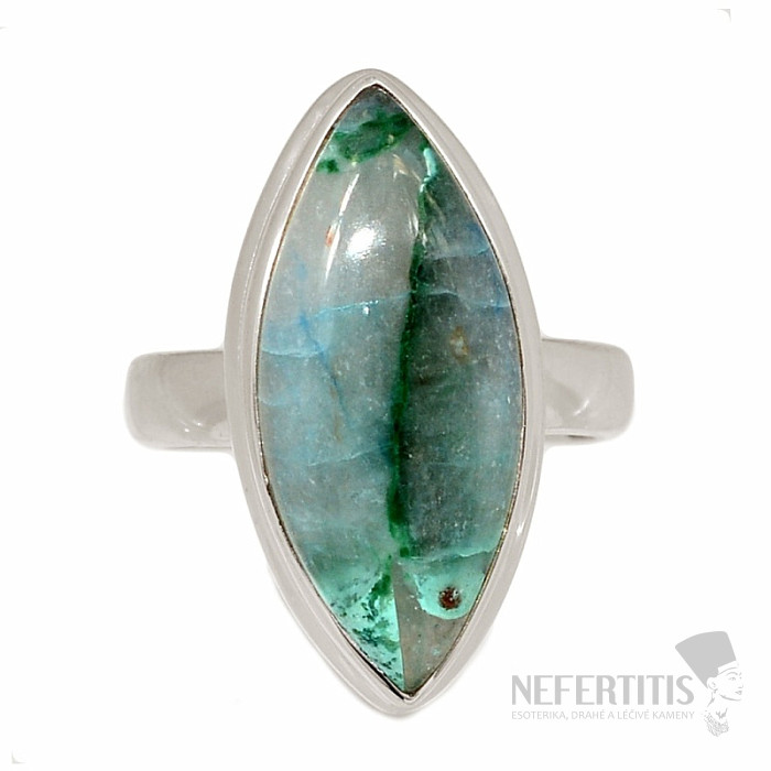 Pôvabný strieborný prsteň so vzácnym a zberateľsky ceneným prírodným Quantum quattro. Ag 925. Quantum quattro je kombináciou štyroch minerálov - shattuckitu, dioptasu, malachitu a chryzokolu. Každý šperk je originálny, neopakovateľný a vďaka farebnej kombinácii a usporiadaniu minerálov podnecuje fantáziu, pripomína pohľad na Zem z vtáčej perspektívy. Budete mať krásny šperk, ktorý nikto neprehliadne, vhodný na rôzne príležitosti. Kupujete priamo vyobrazený šperk. Veľkosť kameňa cca 2,2 cm.