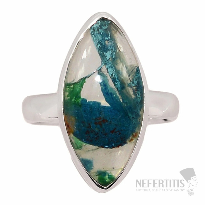 Pôvabný strieborný prsteň so vzácnym a zberateľsky ceneným prírodným Quantum quattro. Ag 925. Quantum quattro je kombináciou štyroch minerálov - shattuckitu, dioptasu, malachitu a chryzokolu. Každý šperk je originálny, neopakovateľný a vďaka farebnej kombinácii a usporiadaniu minerálov podnecuje fantáziu, pripomína pohľad na Zem z vtáčej perspektívy. Budete mať krásny šperk, ktorý nikto neprehliadne, vhodný na rôzne príležitosti. Kupujete priamo vyobrazený šperk. Veľkosť kameňa cca 2,2 cm.
