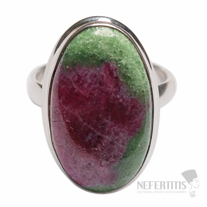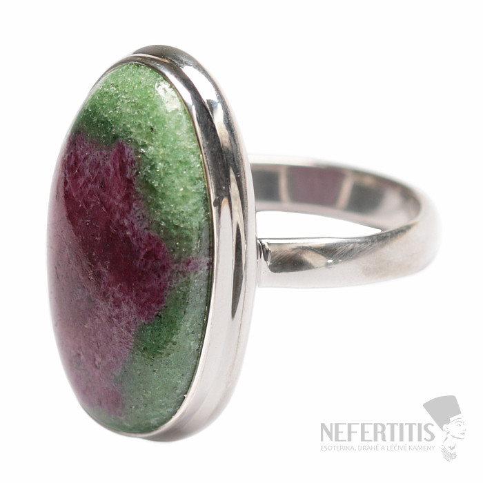Krásny prsteň s rubínom v zoisite v striebre . Mimoriadne pekný kameň, aký máme v ponuke len zriedka kedy, sa vyznačuje sýtymi farbami šarlátového rubínu a niekoľkými tónmi zelenej farby zositu. Nielen vďaka farbám, ale aj nádhernej kresbe kameňa je tento prsteň unikátny a neprehliadnuteľný. Veľkosť kameňa cca 2,5 cm. Ag 925. Kupujete priamo vyobrazený šperk.