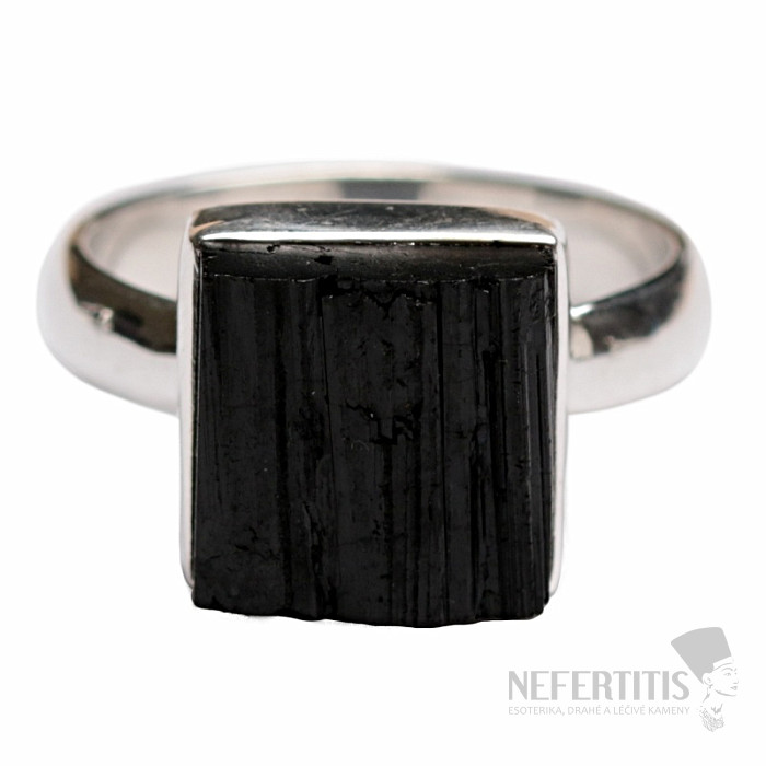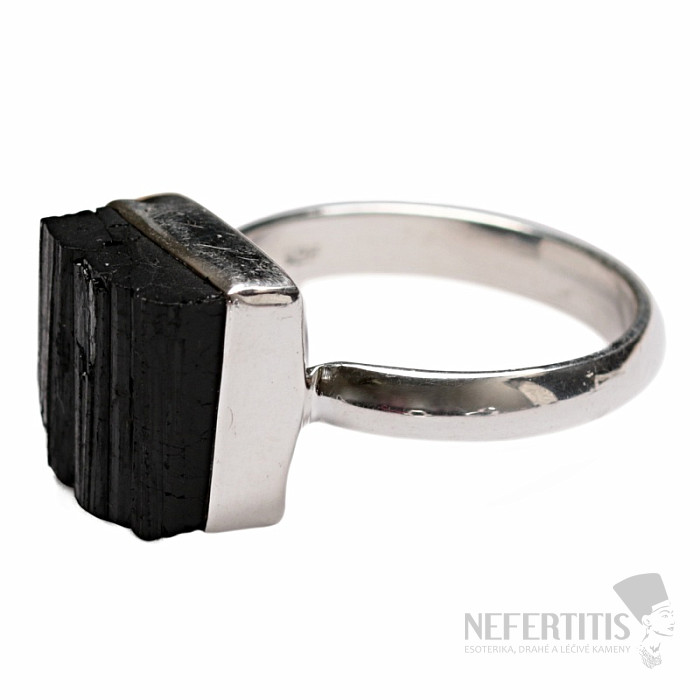 Atraktívny, elegantný, až trochu tajomný prsteň z veľkého surového čierneho turmalínu skorylu v striebre. Čierna farba turmalínu, ktorá krásne kontrastuje s leskom strieborného rámčeka, dáva tomuto prstenu eleganciu a robí z neho veľmi dekoratívny šperk. Čierne surové turmalíny bežne obsahujú prasklinky, je to ich charakteristický rys a dôkaz, že kupujete pravý prírodný tumalín. Ag 925. Veľkosť kameňa cca 1,1 cm. Kupujete priamo vyobrazený šperk.