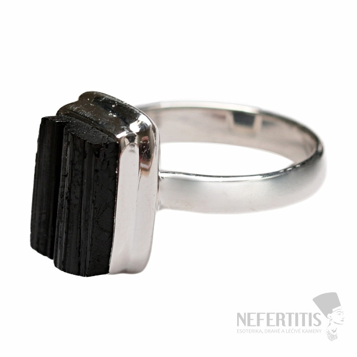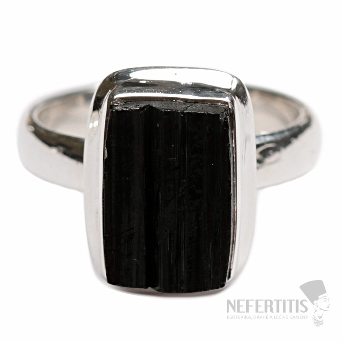 Atraktívny, elegantný, až trochu tajomný prsteň z veľkého surového čierneho turmalínu skorylu v striebre. Čierna farba turmalínu, ktorá krásne kontrastuje s leskom strieborného rámčeka, dáva tomuto prstenu eleganciu a robí z neho veľmi dekoratívny šperk. Čierne surové turmalíny bežne obsahujú prasklinky, je to ich charakteristický rys a dôkaz, že kupujete pravý prírodný tumalín. Ag 925. Veľkosť kameňa cca 1,2 cm. Kupujete priamo vyobrazený šperk.