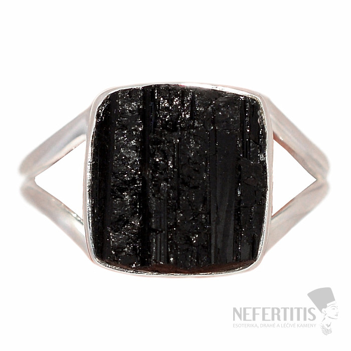 Atraktívny, elegantný, až trochu tajomný prsteň z veľkého surového čierneho turmalínu skorylu v striebre. Čierna farba turmalínu, ktorá krásne kontrastuje s leskom strieborného rámčeka, dáva tomuto prstenu eleganciu a robí z neho veľmi dekoratívny šperk. Čierne surové turmalíny bežne obsahujú prasklinky, je to ich charakteristický rys a dôkaz, že kupujete pravý prírodný tumalín. Ag 925. Veľkosť kameňa cca 1,2 cm. Kupujete priamo vyobrazený šperk.