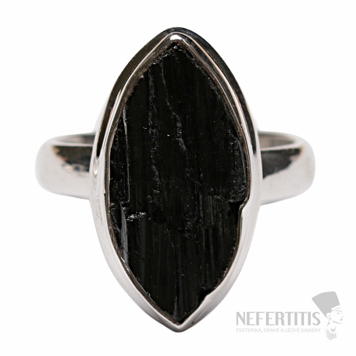 Atraktívny, elegantný, až trochu tajomný prsteň z veľkého surového čierneho turmalínu skorylu v striebre. Čierna farba turmalínu, ktorá krásne kontrastuje s leskom strieborného rámčeka, dáva tomuto prstenu eleganciu a robí z neho veľmi dekoratívny šperk. Čierne surové turmalíny bežne obsahujú prasklinky, je to ich charakteristický rys a dôkaz, že kupujete pravý prírodný tumalín. Ag 925. Veľkosť kameňa cca 1,9 cm. Kupujete priamo vyobrazený šperk.