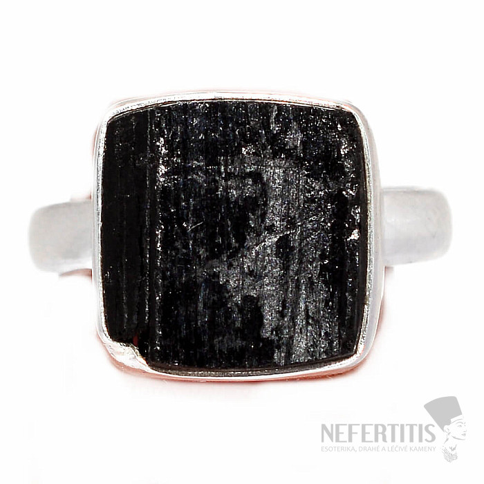 Atraktívny, elegantný, až trochu tajomný prsteň z veľkého surového čierneho turmalínu skorylu v striebre. Čierna farba turmalínu, ktorá krásne kontrastuje s leskom strieborného rámčeka, dáva tomuto prstenu eleganciu a robí z neho veľmi dekoratívny šperk. Čierne surové turmalíny bežne obsahujú prasklinky, je to ich charakteristický rys a dôkaz, že kupujete pravý prírodný tumalín. Ag 925. Veľkosť kameňa cca 1,4 cm. Kupujete priamo vyobrazený šperk.