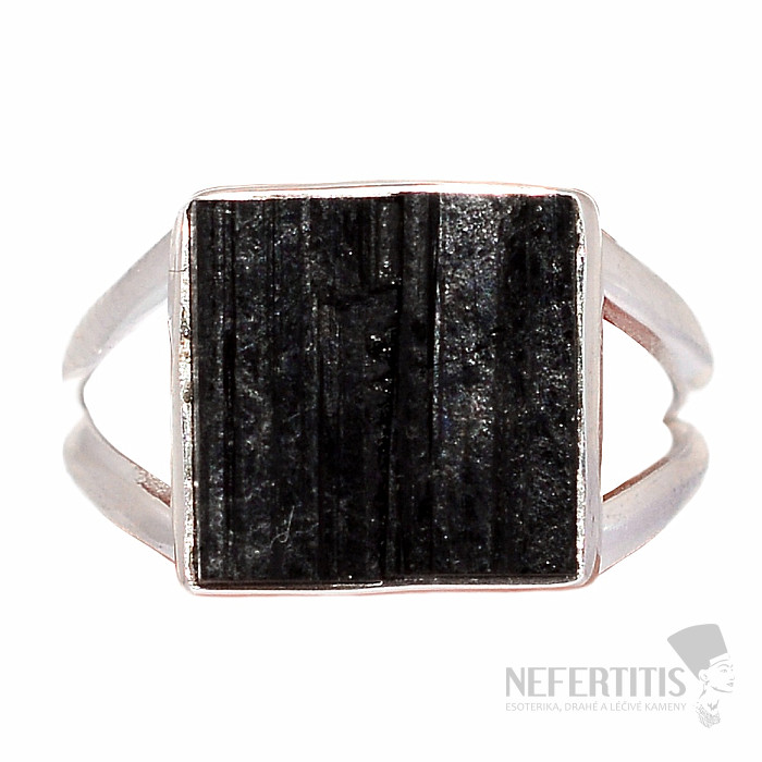 Atraktívny, elegantný, až trochu tajomný prsteň z veľkého surového čierneho turmalínu skorylu v striebre. Čierna farba turmalínu, ktorá krásne kontrastuje s leskom strieborného rámčeka, dáva tomuto prstenu eleganciu a robí z neho veľmi dekoratívny šperk. Čierne surové turmalíny bežne obsahujú prasklinky, je to ich charakteristický rys a dôkaz, že kupujete pravý prírodný tumalín. Ag 925. Veľkosť kameňa cca 1,1 cm. Kupujete priamo vyobrazený šperk.