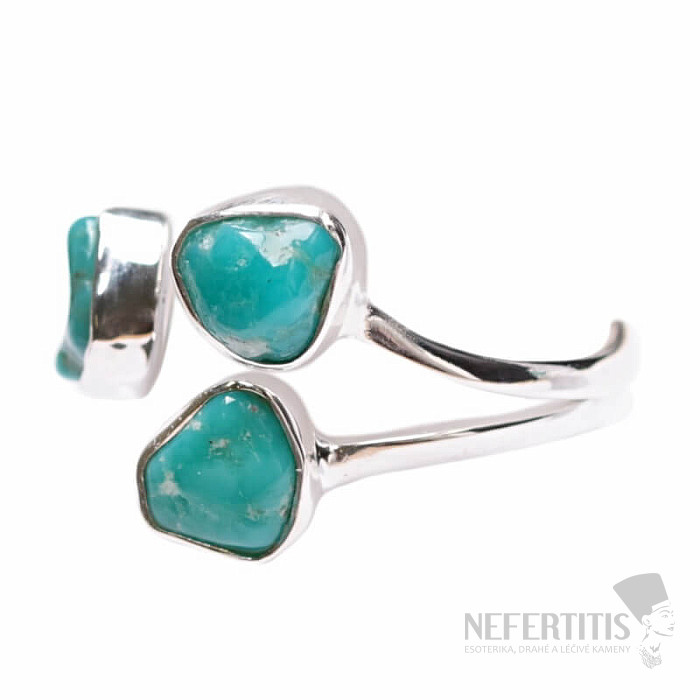 Výrazný a veľmi elegantný s trojborný prsteň z modrého tyrkysu , takzvaný "Kingmanov tyrkys", ťaženému v oblasti Kingman v Arizone, USA. Jedná sa o vysoko kvalitný kameň známy pre svoju bohatú modrú a zelenú farbu a charakteristické žilkovanie. Ag 925. Veľkosť jednotlivých kameňov cca 0,4 – 0,6 cm. Kupujete priamo vyobrazený šperk.