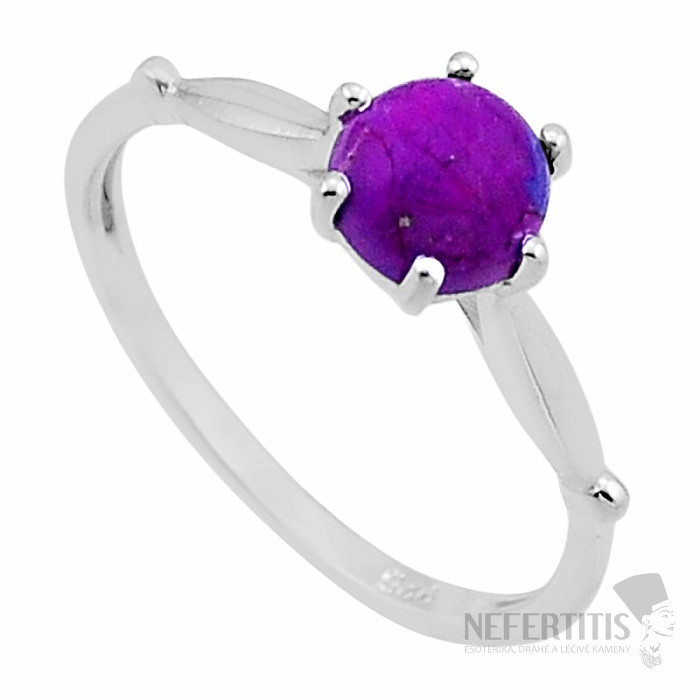 Výnimočný strieborný prsteň s kúskami prírodného tyrkysu , spájaných meďou do jedného pôsobivého kabošonu krásnej purpurovo-fialovej farby. Tejto farby je docielené dofarbovaním kameňa. Tento typ šperkov získava vo svete na veľkej obľube z dôvodu stále rastúcej ceny jednoliatych kusov prírodného tyrkysu. Takto vytvárané kabošony sú jednou z mála možností, ako si dnes zaobstarať šperk s prírodným tyrkysom za relatívne dostupnú cenu. Ag 925. Veľkosť kameňa cca 0,6 cm. Kupujete priamo vyobrazený šperk.