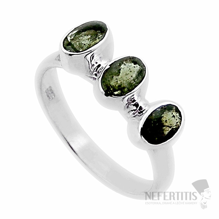 Strieborný prsteň s brúsenými vltavínami. Ag 925. Vltavín je považovaný za talizman šťastia. Kupujete priamo vyobrazený kus. Veľkosť jednotlivých vltavínov cca 0,6 cm.