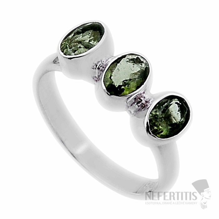 Strieborný prsteň s brúsenými vltavínami. Ag 925. Vltavín je považovaný za talizman šťastia. Kupujete priamo vyobrazený kus. Veľkosť jednotlivých vltavínov cca 0,6 cm.