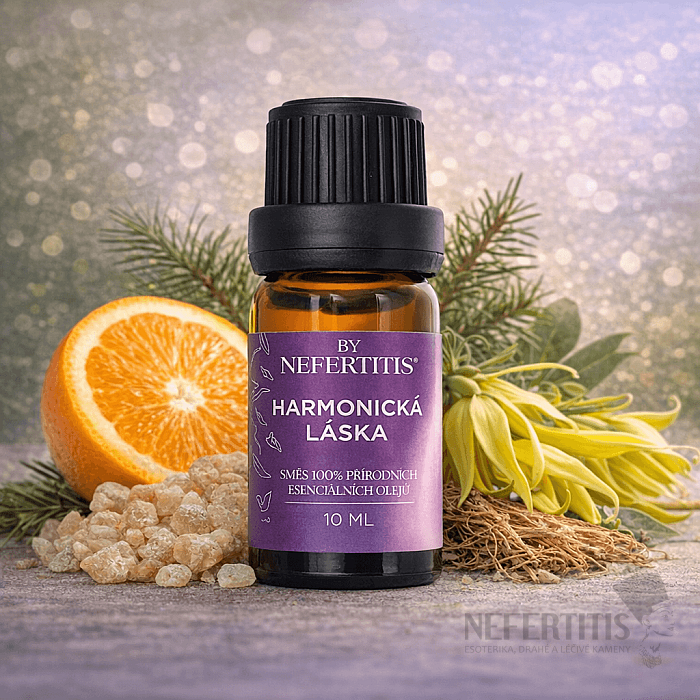 Rituálna zmes 100% prírodných esenciálnych olejov, ideálna do arómy lampy a arómy difúzera. By Nefertitis Harmonická láska je zmyslová rituálna zmes 100% esenciálnych olejov z ylang-ylang extra, sladkého pomaranča, himalájskeho cédra a pravého kadidlovníka. Harmonická kompozícia kvetových, citrusových a jemne drevitých tónov vytvára hrejivú, príjemnú atmosféru podporujúcu pocit blízkosti, pohody a vnútornej rovnováhy. Zmes vznikla ako originálna receptúra v našej kúzelnej dielni Nefertitis.