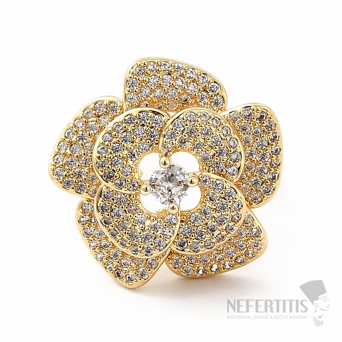 Tento výrazný dámsky prsteň je šperk z mosadze s povrchovou úpravou 18K pozlátenia. Je osadený desiatkami kubických zirkónov, ktoré vytvárajú okvetné lístky veľké kvety. Prsteň tak pôsobí jemne, ženským dojmom a pritom je dostatočne výrazný, aby sa stal hlavnou ozdobou ruky. Materiál: mosadz pozlátená 18K zlatom, kubická zirkónia, kvetina: cca 2,5 cm. Ilustratívne vyobrazenie.
