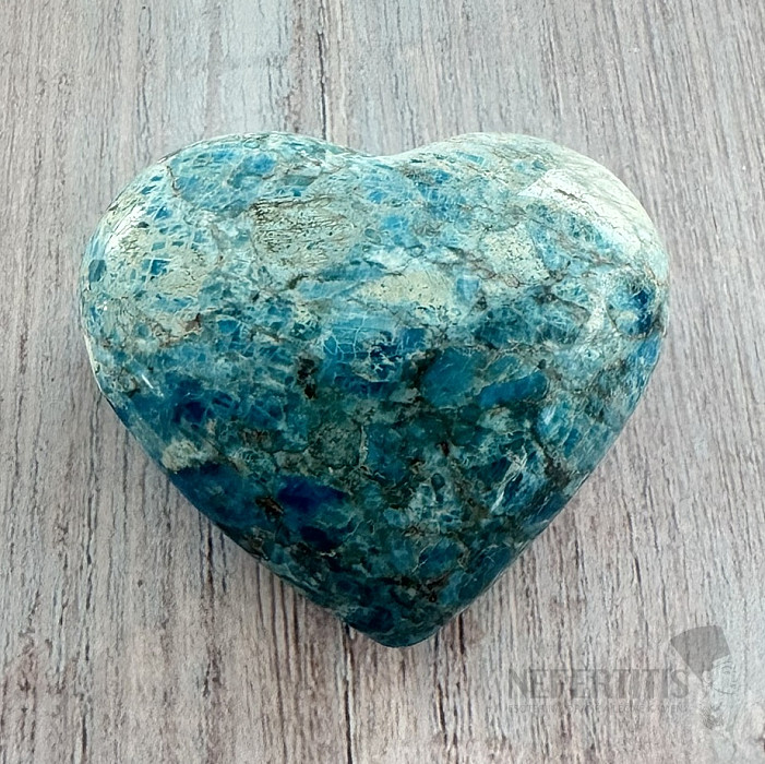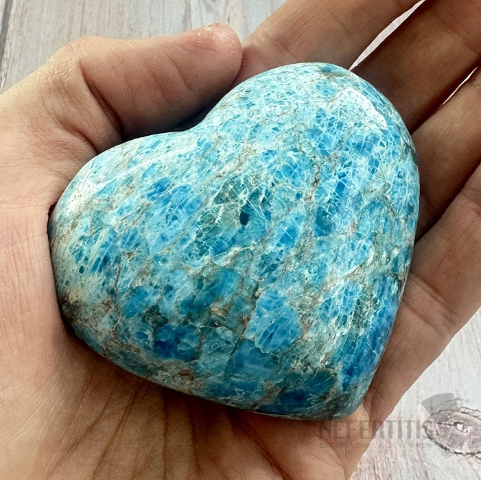 Leštený apatit v tvare srdca výberovej kvality. Krajina pôvodu: Madagaskar. Kupujete priamo vyobrazené srdce. Stojančeky a podstavce pod minerálmi kúpite tu. Modrý apatit je kameňom intuície, komunikácie a osobného… viac »