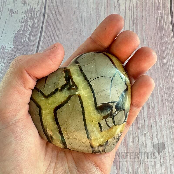 Upozornenie: kameň nie je dokonale ohladený, nechtom sa dajú nahmatať vlasové trhlinky, čo je vlastnosťou septárie. V septárii sú otvory s viditeľným zoskupením kryštálov. Vlasové trhlinky ani "okienka" s kryštálmi nemôžu byť predmetom prípadnej reklamácie.