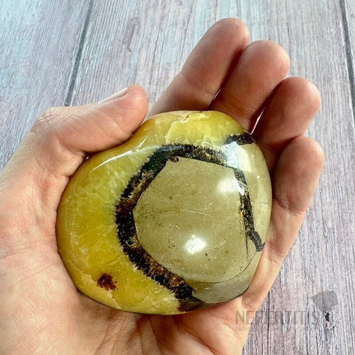 Upozornenie: kameň nie je dokonale ohladený, nechtom sa dajú nahmatať vlasové trhlinky, čo je vlastnosťou septárie. V septárii sú otvory s viditeľným zoskupením kryštálov. Vlasové trhlinky ani "okienka" s kryštálmi nemôžu byť predmetom prípadnej reklamácie.
