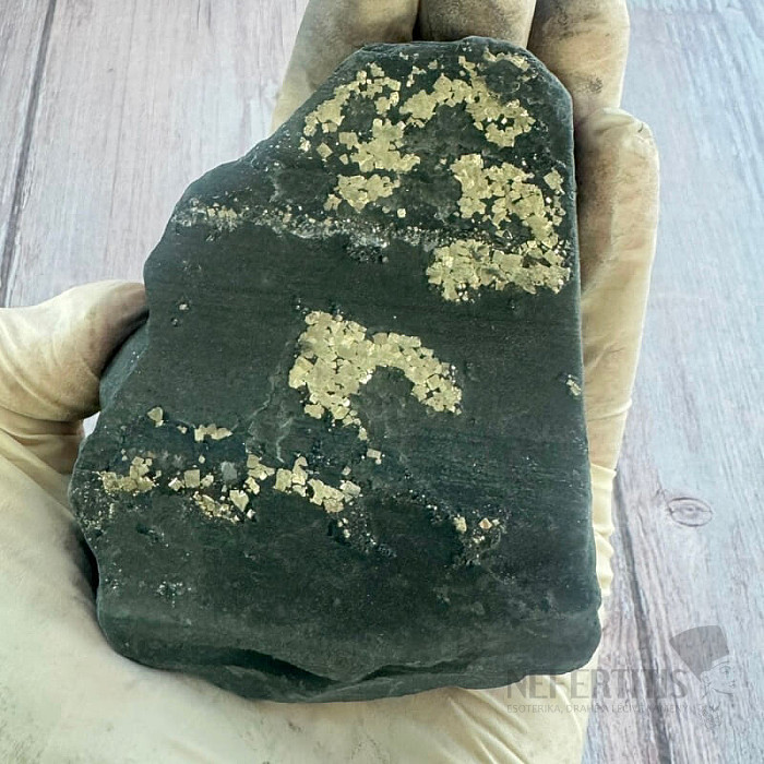 Zbierkový surový šungit s kryštálmi pyritu . Kupujete priamo vyobrazený kus