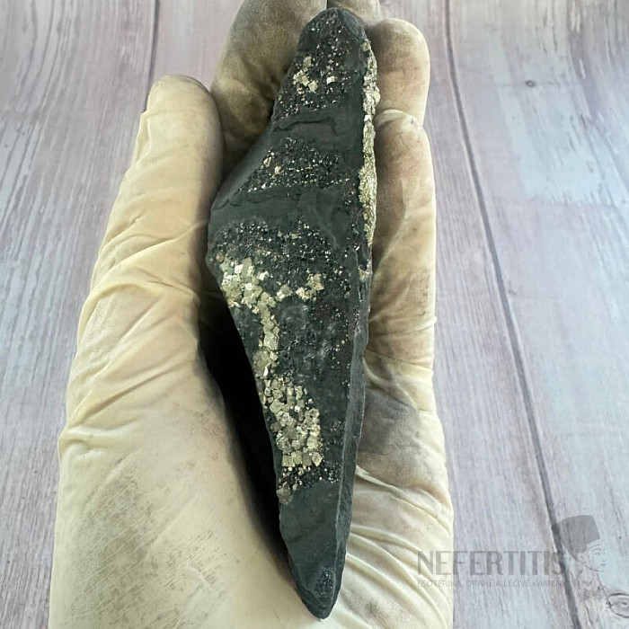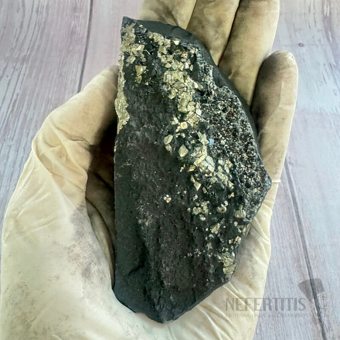 Zbierkový surový šungit s kryštálmi pyritu . Kupujete priamo vyobrazený kus