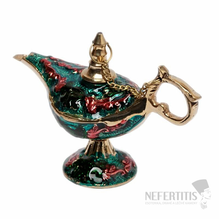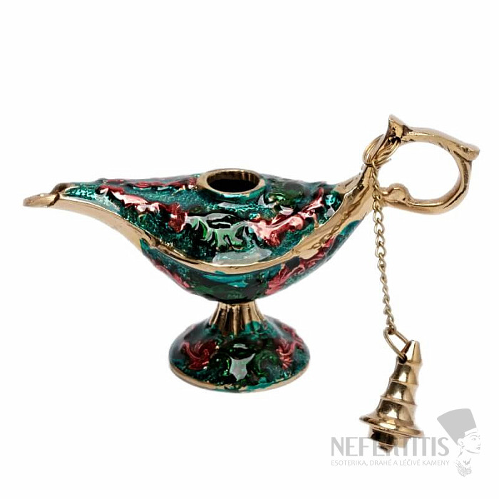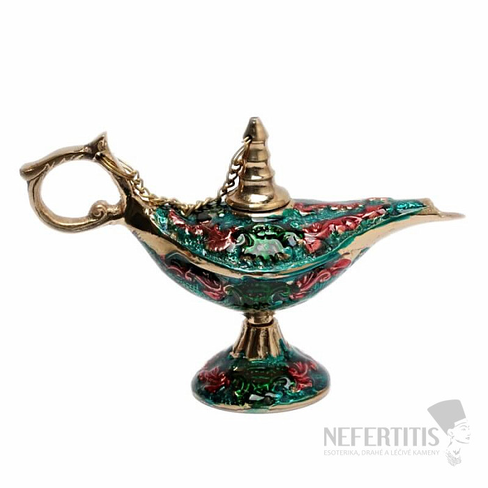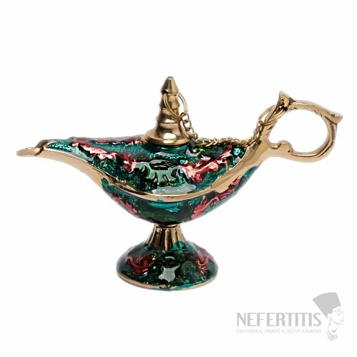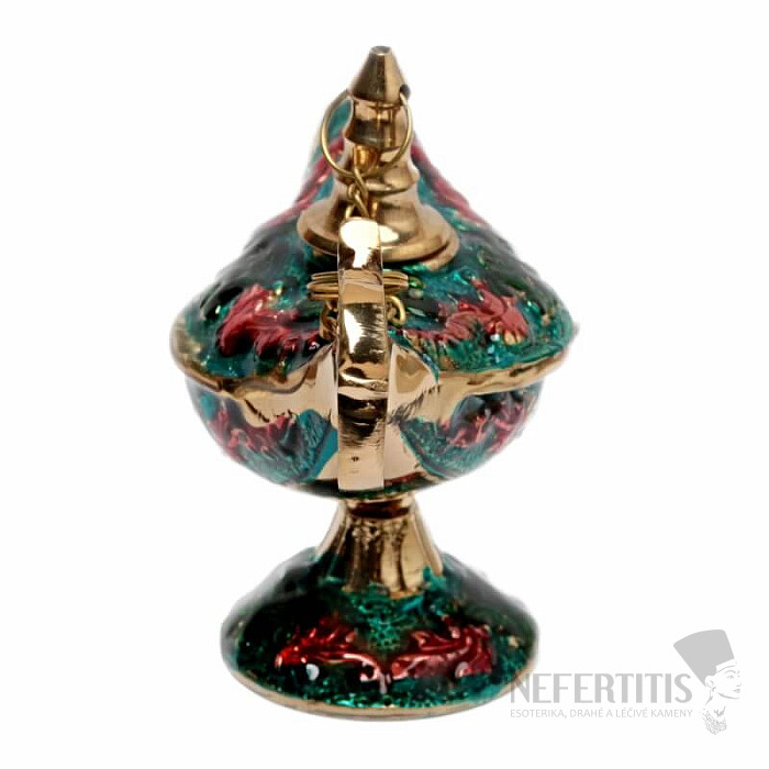 Atraktívna olejová zdobená Aladinova lampa z rozprávok 1000 a jednej noci. Krásna dekorácia, pomocník na meditáciu, chvíle relaxácie a aromaterapiu. Lampa je vyrobená z mosadze, ornamentami a farebným emailom. Rozmery: cca 17 x 8 cm (šírka x výška). Ilustratívne vyobrazenie.