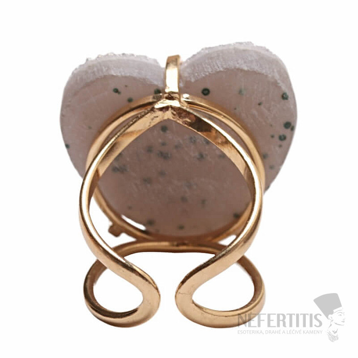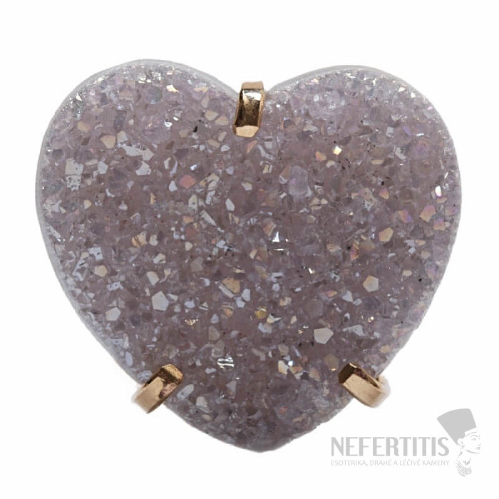 Objavte kúzlo elegancie s týmto pozláteným prsteňom, ktorého dominantou je drúza z achátu v tvare srdca s aqua aura efektom, ktorý vznikne nanesením tenkej vrstvy kovu. Drúza sa tak krásne trblieta. Každý kameň je originál. Achát je kameňom ochrany, sily a harmónie a skvele podčiarkne vašu osobnosť. Materiál: prírodný kameň, pozlátená mosadz. Kupujete priamo vyobrazený prsteň.