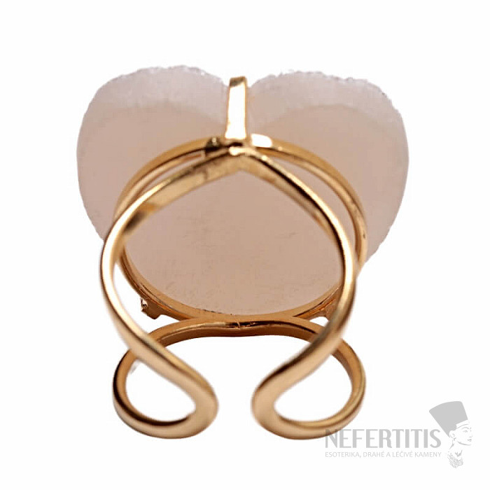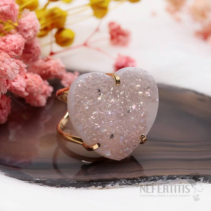 Objavte kúzlo elegancie s týmto pozláteným prsteňom, ktorého dominantou je drúza z achátu v tvare srdca s aqua aura efektom, ktorý vznikne nanesením tenkej vrstvy kovu. Drúza sa tak krásne trblieta. Každý kameň je originál. Achát je kameňom ochrany, sily a harmónie a skvele podčiarkne vašu osobnosť. Materiál: prírodný kameň, pozlátená mosadz. Kupujete priamo vyobrazený prsteň.