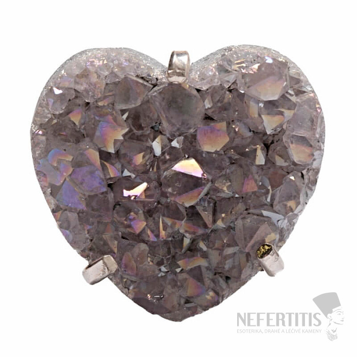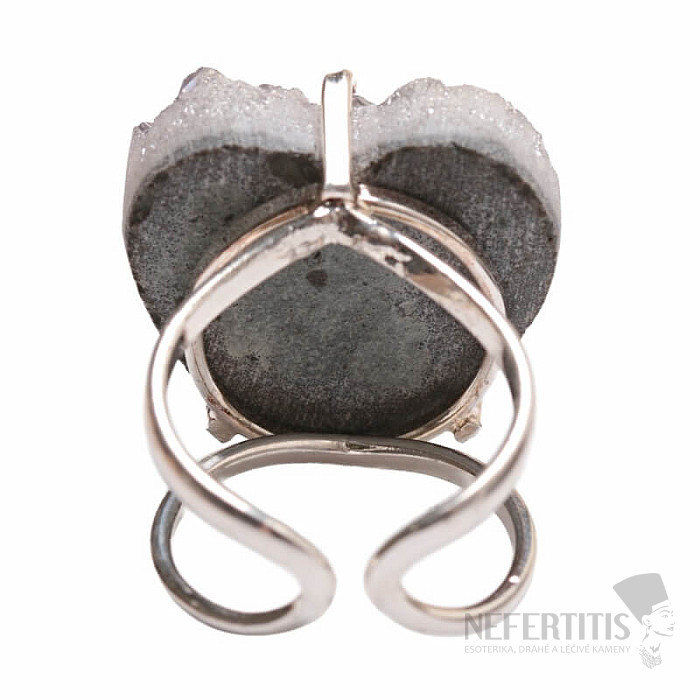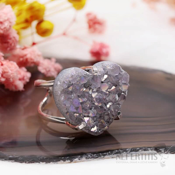 Objavte kúzlo elegancie s týmto postriebreným prsteňom, ktorého dominantou je drúza z achátu v tvare srdca s aqua aura efektom, ktorý vznikne nanesením tenkej vrstvy kovu. Drúza sa tak krásne trblieta. Každý kameň je originál. Achát je kameňom ochrany, sily a harmónie a skvele podčiarkne vašu osobnosť. Materiál: prírodný kameň, postriebrená mosadz. Kupujete priamo vyobrazený prsteň.