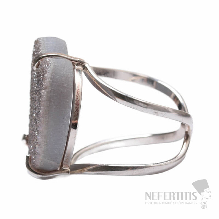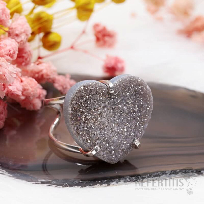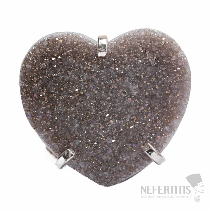 Objavte kúzlo elegancie s týmto postriebreným prsteňom, ktorého dominantou je drúza z achátu v tvare srdca s aqua aura efektom, ktorý vznikne nanesením tenkej vrstvy kovu. Drúza sa tak krásne trblieta. Každý kameň je originál. Achát je kameňom ochrany, sily a harmónie a skvele podčiarkne vašu osobnosť. Materiál: prírodný kameň, postriebrená mosadz. Kupujete priamo vyobrazený prsteň.