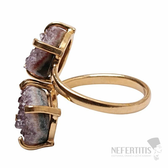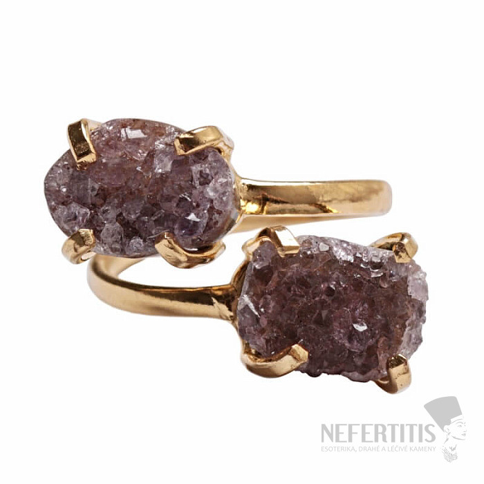Objavte kúzlo nežnej elegancie s týmto pozláteným prsteňom, ktorého dominantou sú dve drúzy ametystu. Každý kameň je originál. Prsteň je oslavou ženskej krásy a individuality. Ametyst je kameňom vášne, lásky a porozumenia. Materiál: prírodný kameň, pozlátená mosadz. Kupujete priamo vyobrazený prsteň.