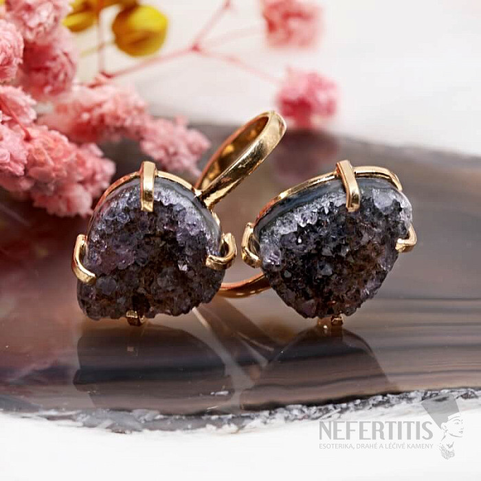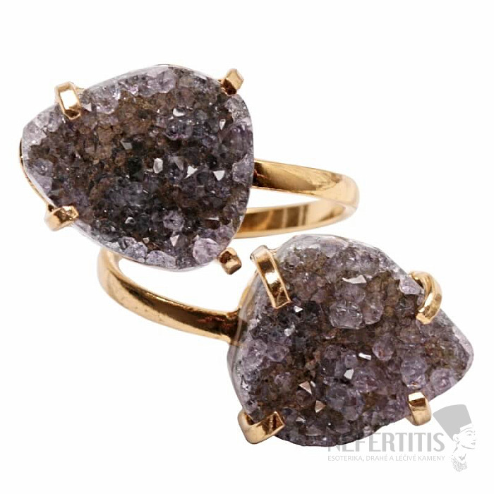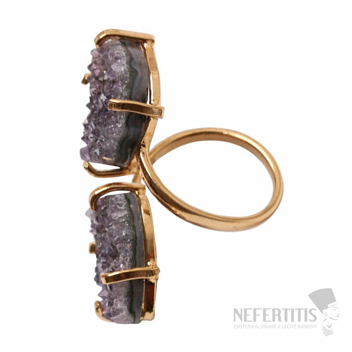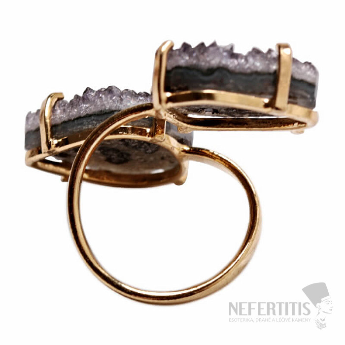 Objavte kúzlo nežnej elegancie s týmto pozláteným prsteňom, ktorého dominantou sú dve drúzy ametystu. Každý kameň je originál. Prsteň je oslavou ženskej krásy a individuality. Ametyst je kameňom vášne, lásky a porozumenia. Materiál: prírodný kameň, pozlátená mosadz. Kupujete priamo vyobrazený prsteň.