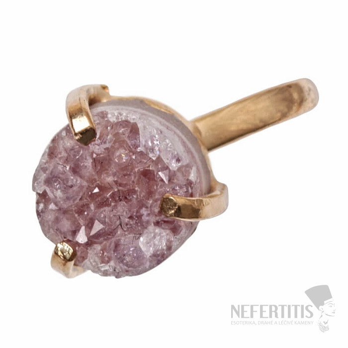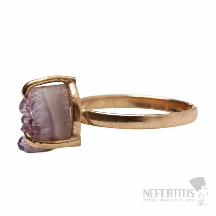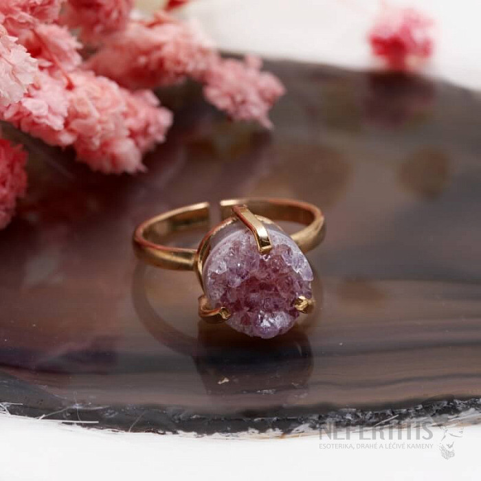 Objavte kúzlo nežnej elegancie s týmto pozláteným prsteňom, ktorého dominantou je drúza ametystu. Každý kameň je originál. Prsteň je oslavou ženskej krásy a individuality. Ametyst je kameňom vášne, lásky a porozumenia. Materiál: prírodný kameň, pozlátená mosadz. Kupujete priamo vyobrazený prsteň.