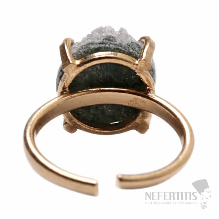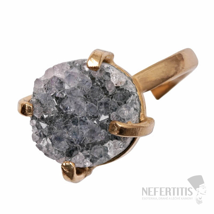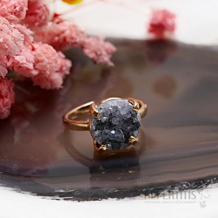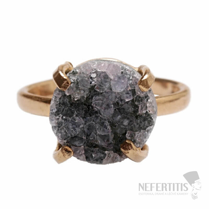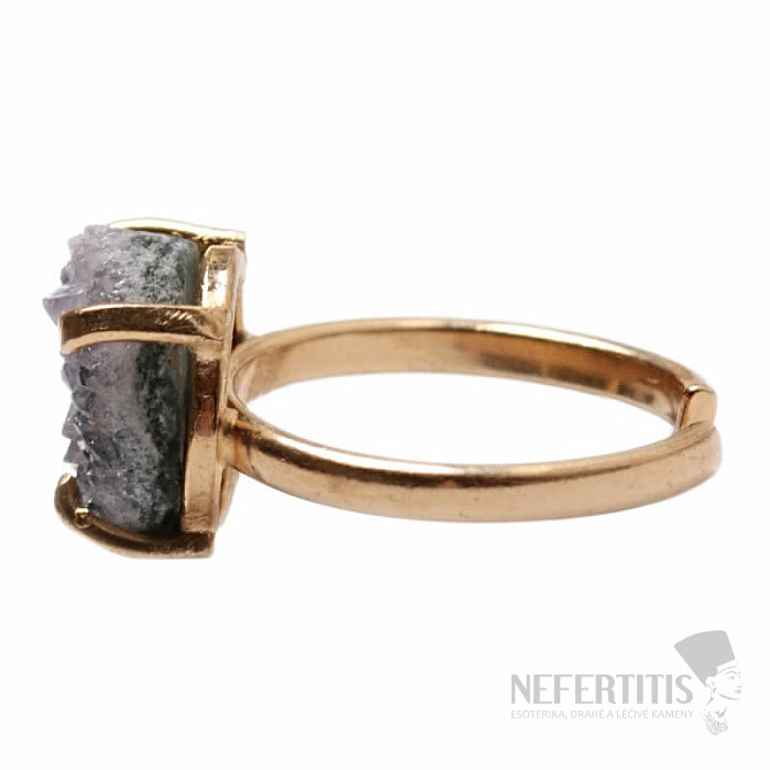 Objavte kúzlo nežnej elegancie s týmto pozláteným prsteňom, ktorého dominantou je drúza ametystu. Každý kameň je originál. Prsteň je oslavou ženskej krásy a individuality. Ametyst je kameňom vášne, lásky a porozumenia. Materiál: prírodný kameň, pozlátená mosadz. Kupujete priamo vyobrazený prsteň.