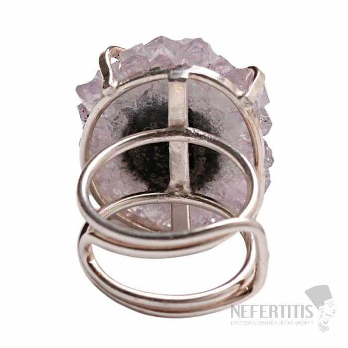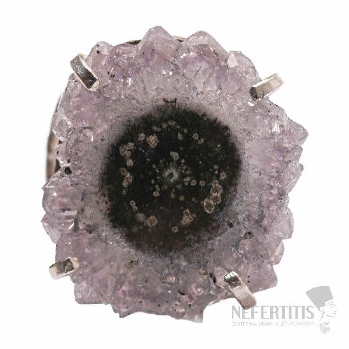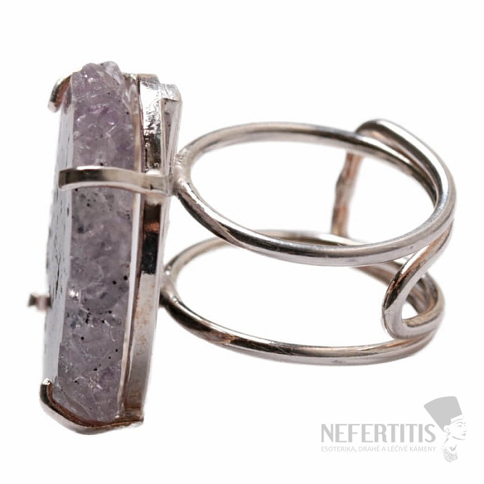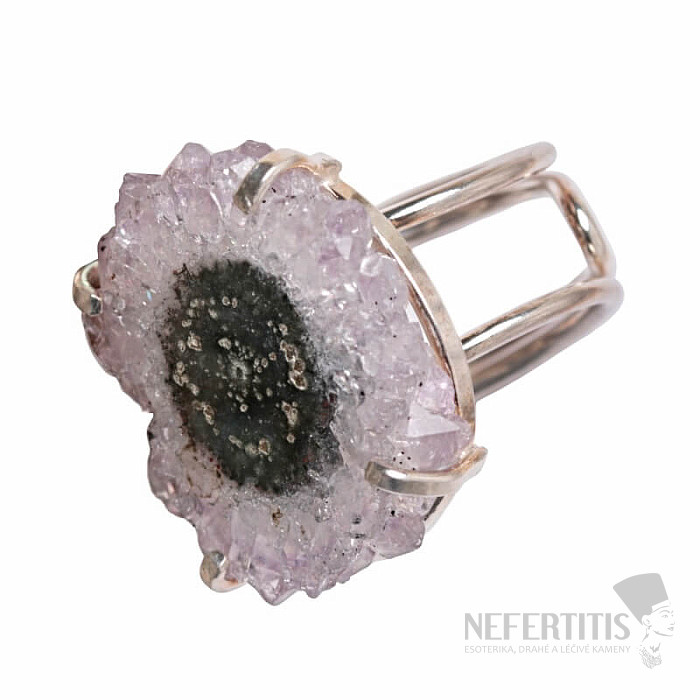 Objavte kúzlo elegancie s týmto postriebreným prsteňom, ktorého dominantou je rez kvapľníkom - stalaktitom ametystu. Každý kameň je originál. Ametyst je kameňom lásky, vášne a porozumenia. Materiál: prírodný kameň, postriebrená mosadz. Kupujete priamo vyobrazený prsteň.