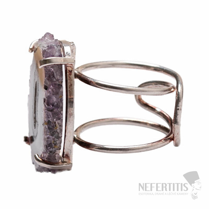 Objavte kúzlo elegancie s týmto postriebreným prsteňom, ktorého dominantou je rez kvapľníkom - stalaktitom ametystu. Každý kameň je originál. Ametyst je kameňom lásky, vášne a porozumenia. Materiál: prírodný kameň, postriebrená mosadz. Kupujete priamo vyobrazený prsteň.